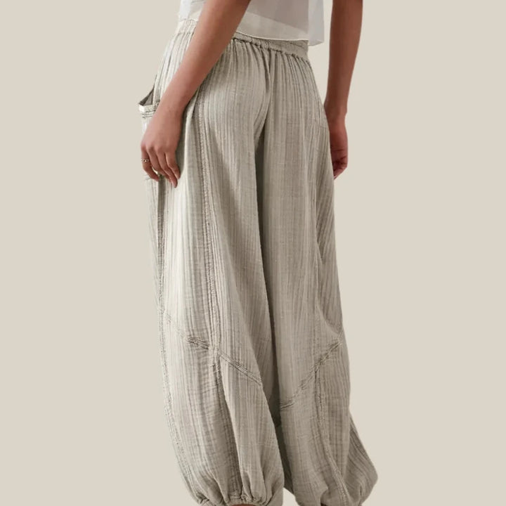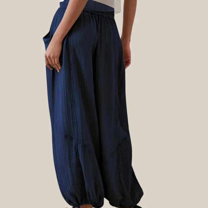 Loose pants with a wide and airy cut, made of a pleasant to the touch fabric and suitable for any season. An elastic waistband ensures a perfect fit and comfort throughout the day, and the practical pockets add both utility and chic. Ideal for everyday wear - the flattering look and uncompromising comfort will make them a must-have item in your wardrobe.