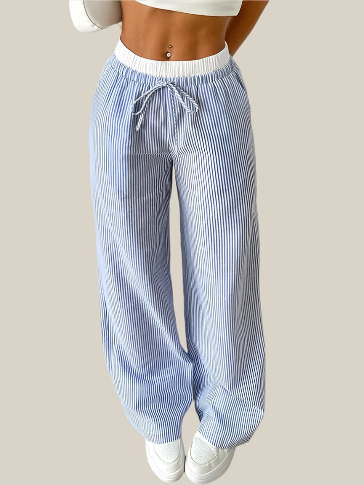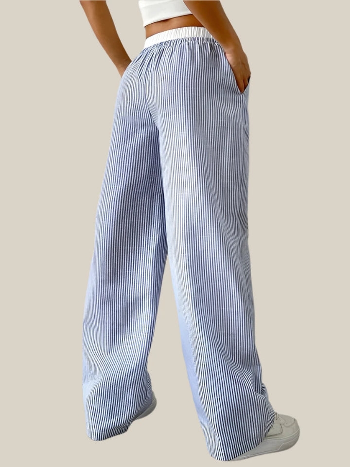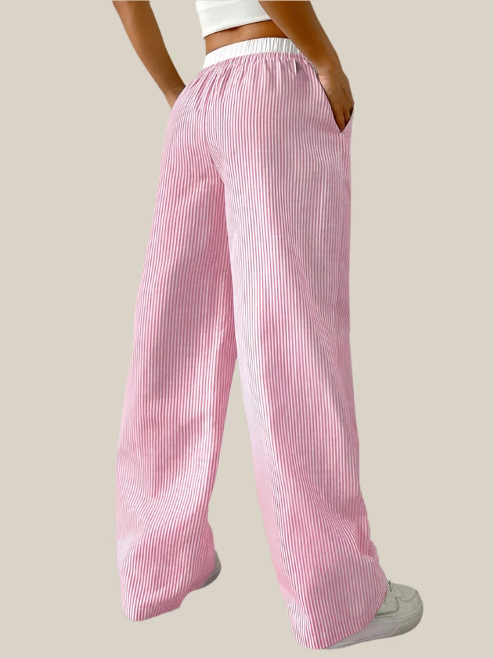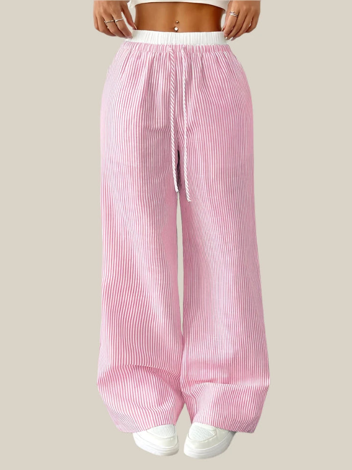 המכנסיים מעוצבים בגזרה רחבה עם פסים טרנדיים ליצירת מראה אורבני מושלם.