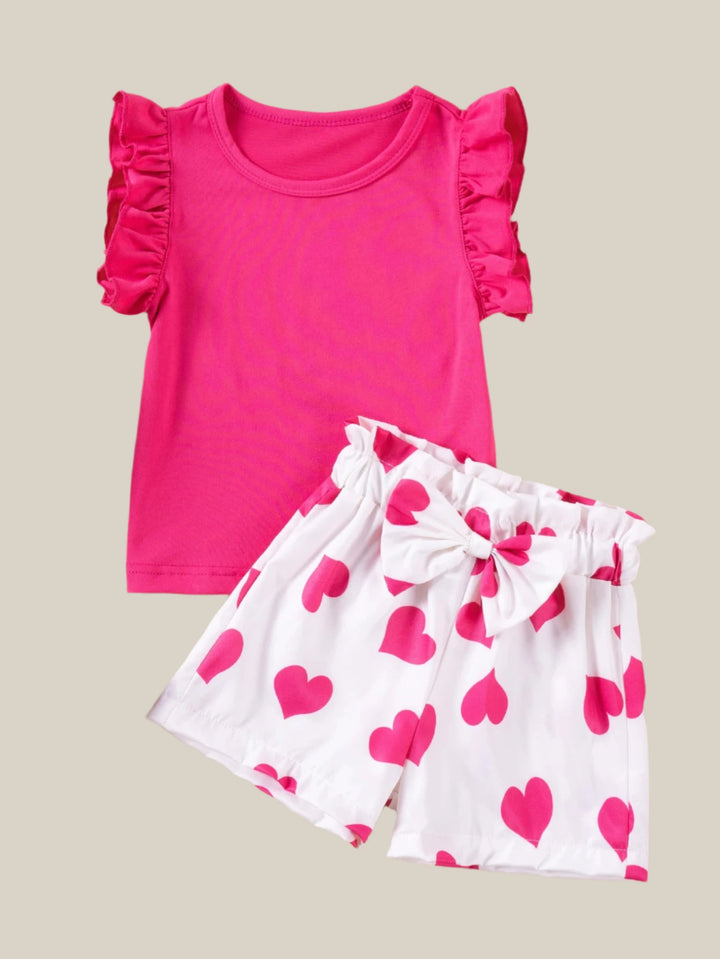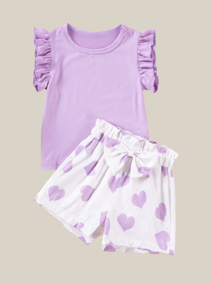 חליפת גן לבנות מגיל שנה ועד 5 כוללת חולצה בצבע ורוד/סגול עם צווארון עגול בגזרה נוחה ומחמיאה, ומכנסיים מודפסים בדוגמת לבבות חמודה.