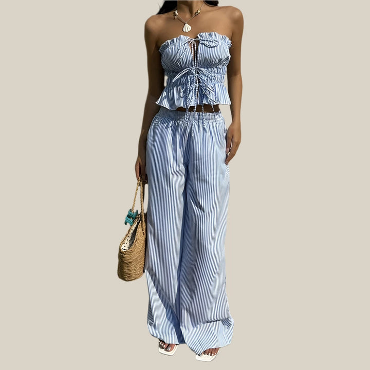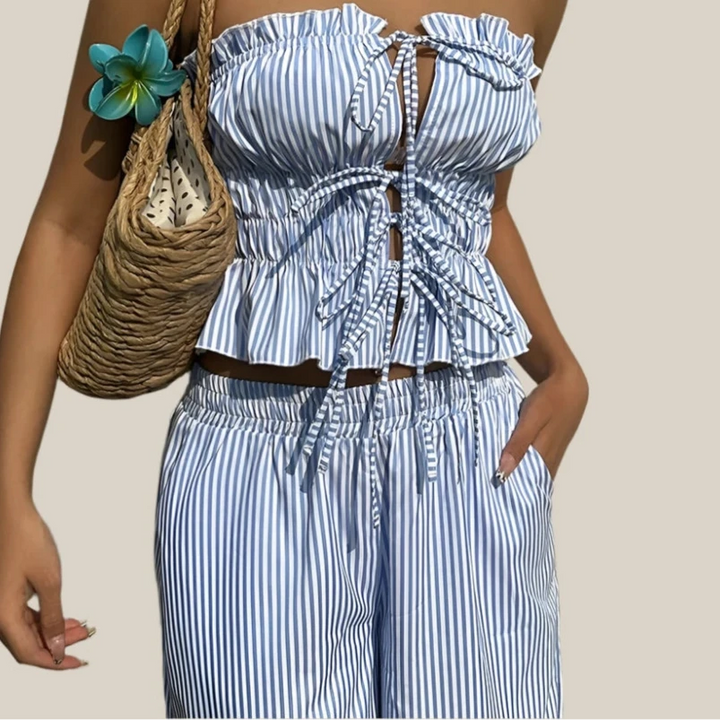 תני לקיץ שלך לבלוט עם הסט המהמם שלנו. הסט כולל טופ חושף כתפיים עם קשירת תחרה רומנטית בשילוב מכנסיים קז'ואל בגזרה גבוהה – לעיצוב נשי, מחמיא ומרענן. מושלם ליום חם בעיר, לבילוי עם חברות או לנופש מלא שיק.