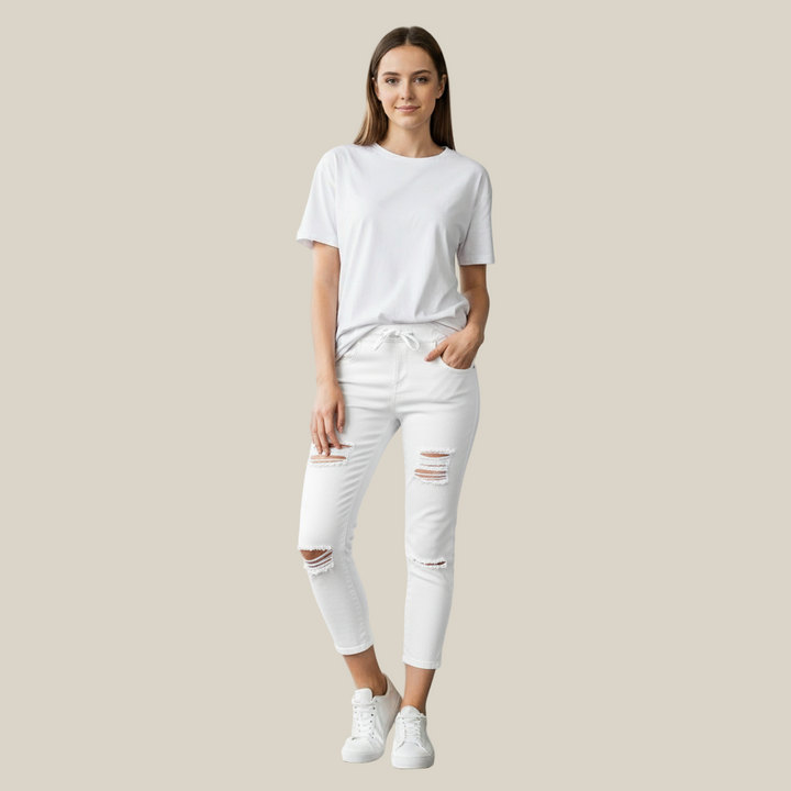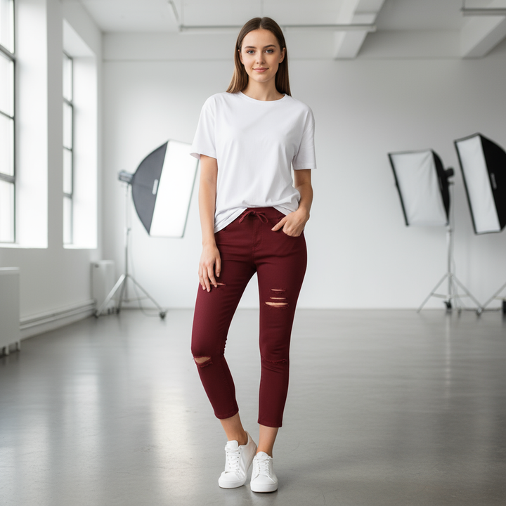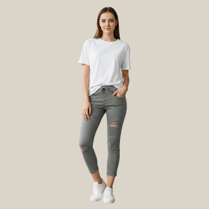 מכנסי ג'ינס סקיני עם מתיחה נוחה, מראה אופנתי ומחמיא שמתאים לכל סגנון ולכל עונה.