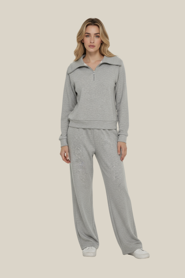 סט קזואל הכולל סווטשירט עם שרוולים ארוכים, צווארון ורוכסן חצי, יחד עם מכנסי שרוך נוחים הניתנים להתאמה קלה למידה.